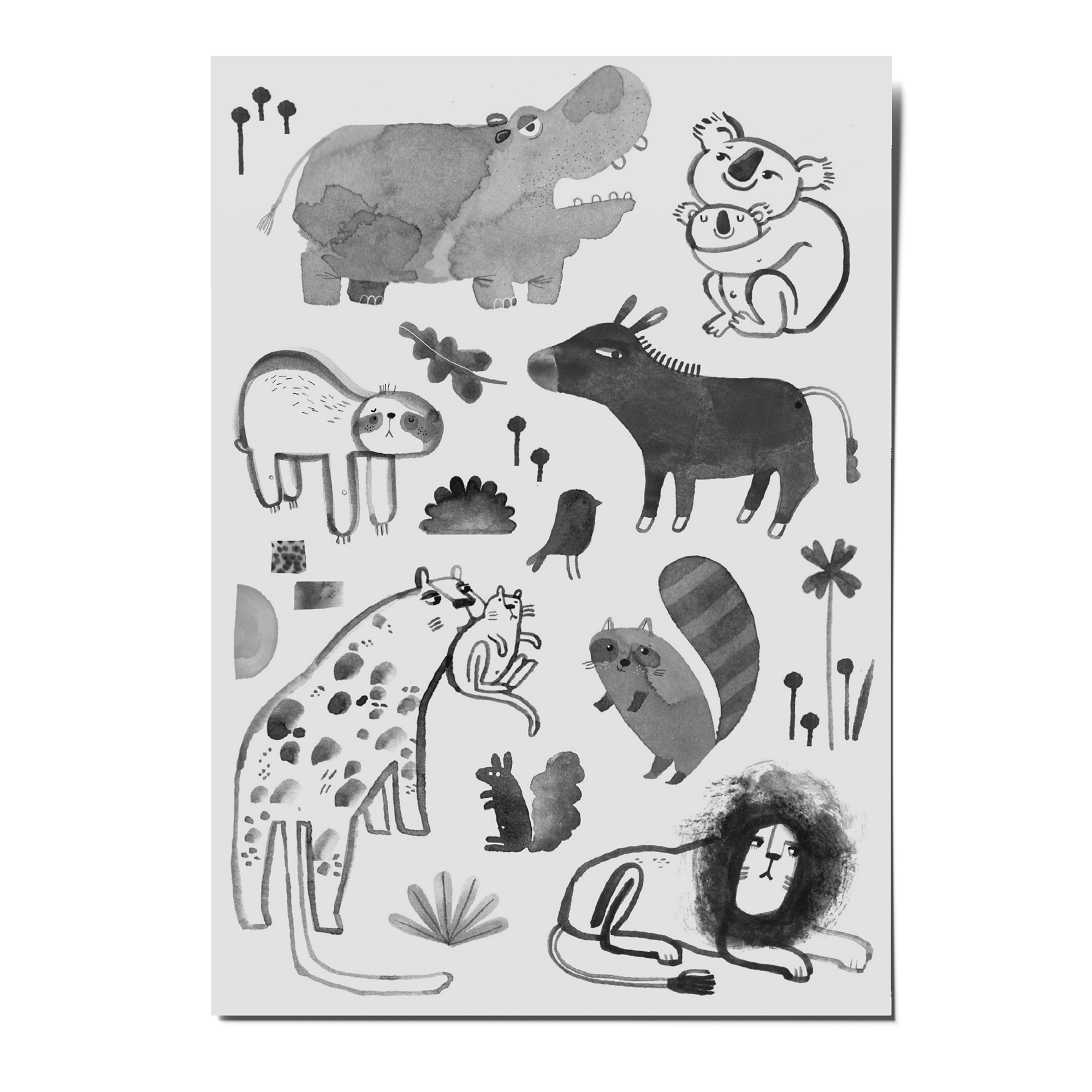Frau Nilpferd und ihre Freunde kommen im schwarzen Aquarell-Look.