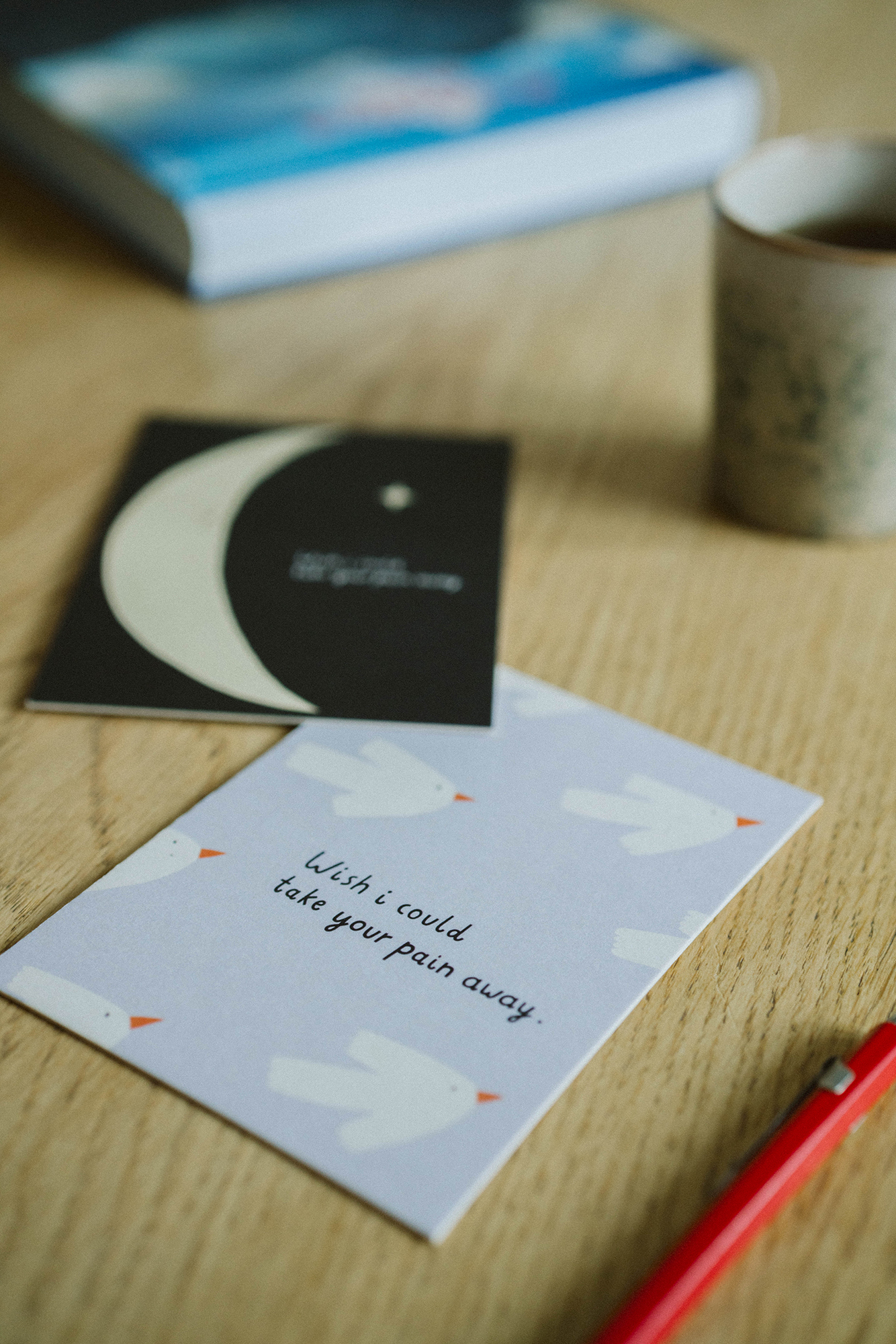 Unsere Beileidskarte mit dem liebevollen Schriftzug „Wish I could take your pain away“ bringt auf dezente Weise Mitgefühl zum Ausdruck. Die zarten, weißen Vögel sind verspielt illustriert und verleihen der Karte eine besondere Leichtigkeit, die sie auch für Kinder geeignet macht.