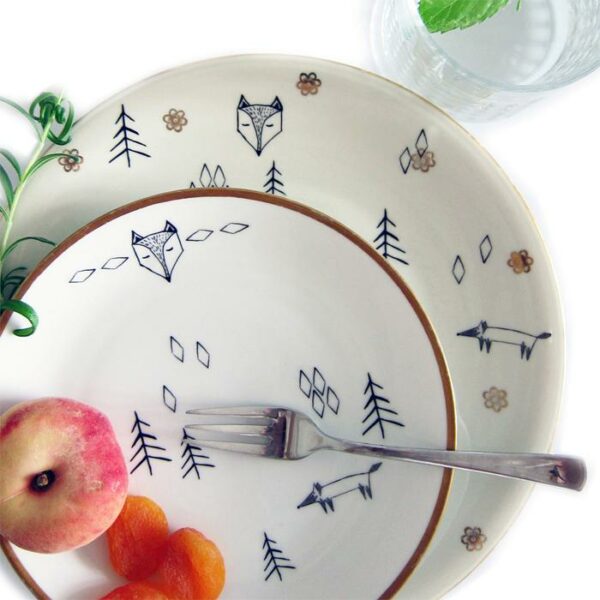 Eckige Füchse für runde Teller. Dieser geometrische Wald macht zackig alles cooler! Einfach aufkleben und einbrennen.